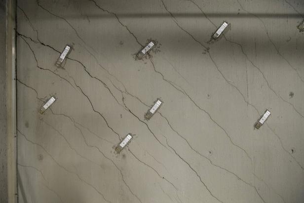 Crack monitors are seen here on a lower level concrete wall.  Distress was also visible in the exterior sidewalks and their joints to the building.